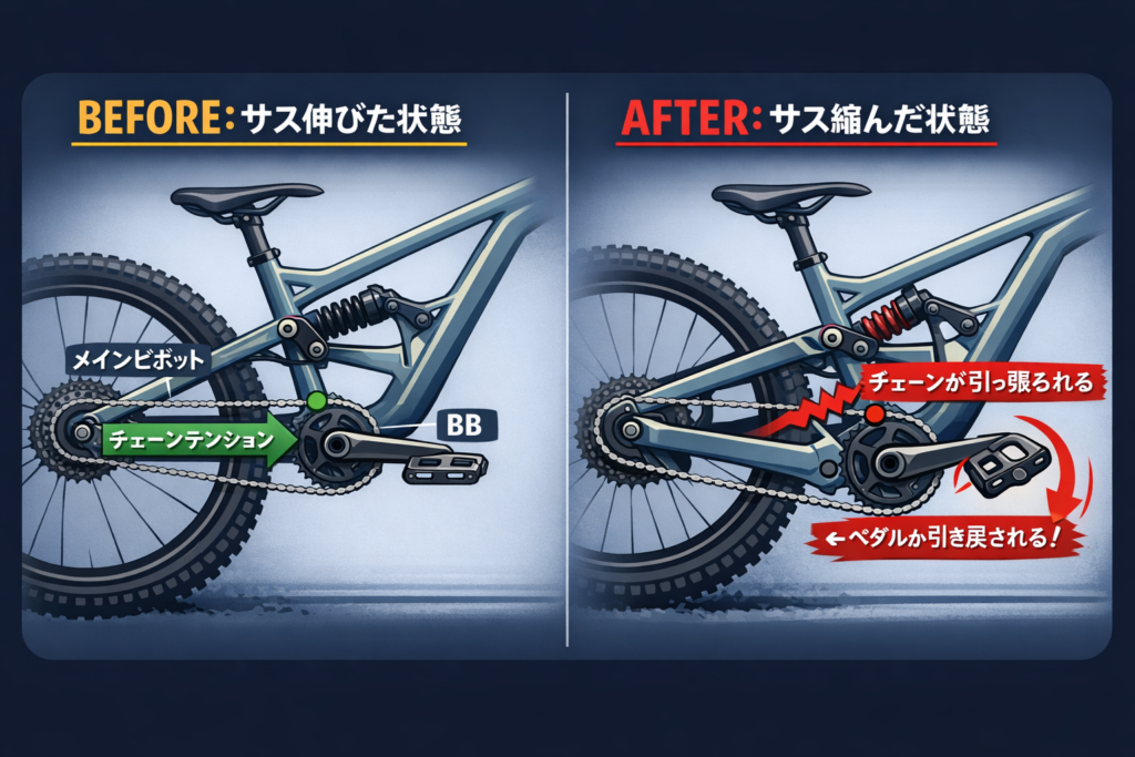 リアサスペンション構造とチェーンテンションの関係で起きます。